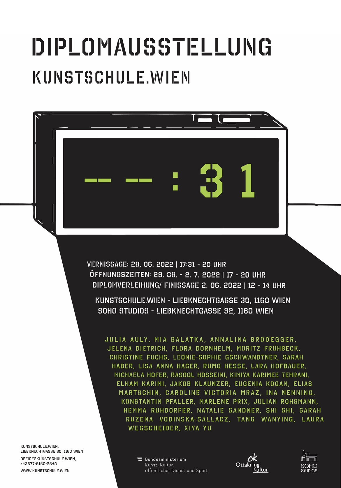 Diplomausstellung Kunstschule.Wien Auch heuer zeigen die Diplomand*innen der Kunstschule.Wien ihre Werke in einer Vielfalt künstlerischer Techniken aus den acht Werkstätten. Vernissage: 28. Juni um 17:31 Uhr Dauer der Ausstellung: 29. Juni – 2. Juli, jeweils 17-20.00 Uhr