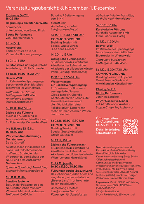 Besucher:innen jeden Alters sind eingeladen, in der Installation „Beaver Land“ in unbekannte Rollen zu schlüpfen, sich auf spielerische Weise mit anderen Lebewesen verwandt zu machen und gemeinsam mit den anwesenden Künstler:innen Franziska Thurner und Fabian Holzinger über unsere Beziehungen zu den Wildtieren und ihrer Umwelt in unserer unmittelbaren Umgebung zu reflektieren. Anmeldung erbeten: info@sohostudios.at