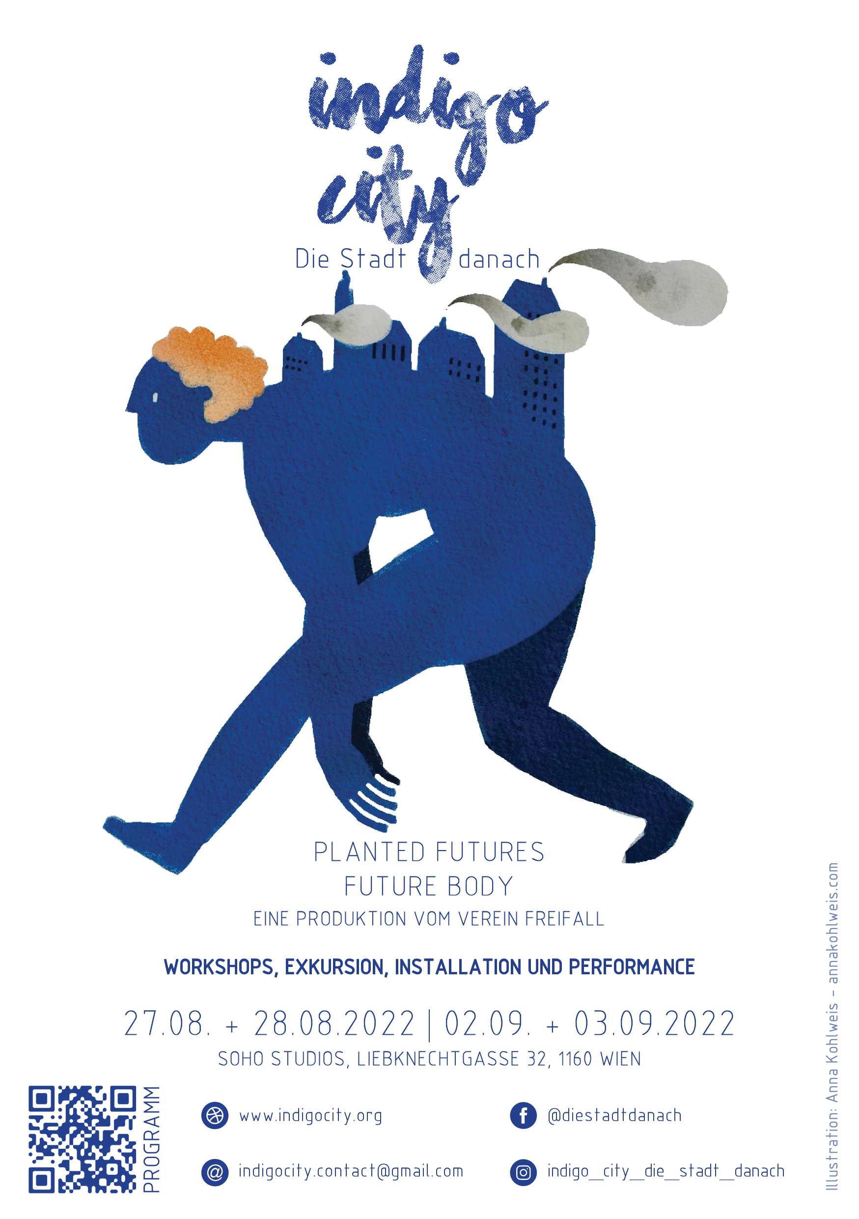 Indigo City – Die Stadt Danach ist ein interdisziplinäres Kunst- und Vermittlungsfestival aus den Bereichen zeitgenössischer Zirkus und Tanz, Ökologie, Textildesign und Stadtforschung. Sie ist Bühne, Installation und Workshopraum in einem und ermutigt zu ersten Schritten, stiftet Ideen und konkretisiert. Visionen für eine gerechte, nachhaltige, produktive und gesunde Stadt. Die Farbe Indigo, als tiefklarer Blauton, wird zur Hoffnungs- und Synergieträgerin. Dieses Jahr, zwischen Mai und September, lässt sich die Indigo City in den SOHO STUDIOS im 16. Bezirk nieder und präsentiert ein vielfältiges Programm:
