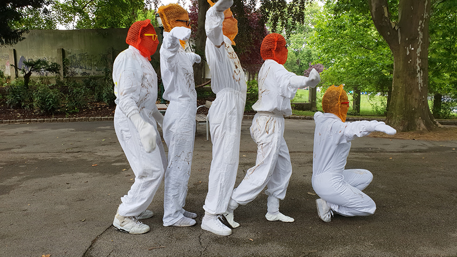 Fünf Schauspieler:innen und Tänzer:innen entpuppen sich wie aus einer anderen Welt in den öffentlichen Raum. In Slow Motion bewegen sich diese Wesen und beginnen sich im Gelände auszubreiten. Ziel ist, eine magische Atmosphäre zu erschaffen, in der Zeit und Raum sich auflösen.