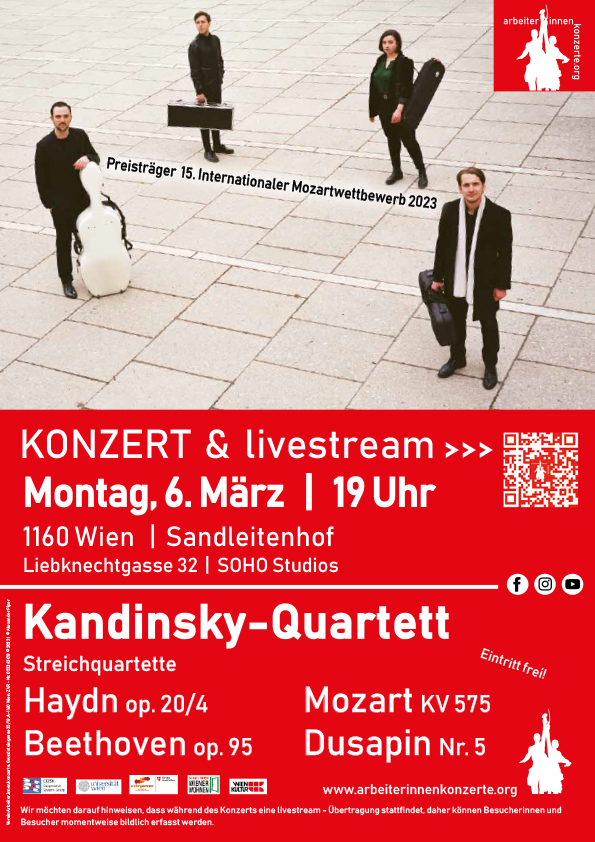 Konzert des Kandinsky-Quartetts Das Kandinsky-Quartett bringt folgende Stücke zur Aufführung: Haydn op. 20/4 Mozart KV 575 Beethoven op. 95 Dusapin Nr. 5